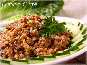 3. 在大盆中放入絞肉、紅蔥頭、蒜末、所有調味料拌勻,灑芝麻、花生與香菜稍拌,以生菜包入食用。