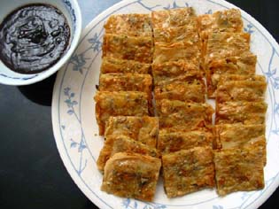 3. 切成四方塊排入盤內,另將調味料B炒勻作成沾料,以供沾食即成。
