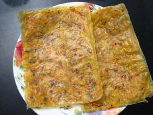 2. 豆腐皮攤開,將一個蛋打散並拌入少許麵粉調成麵糊,每張豆腐皮抹少許麵糊,撒下少許切碎的香菇丁與胡蘿蔔丁,再蓋一張豆腐皮,如此反覆蓋完六張豆腐皮,先用牙籤在豆腐皮上戳洞,然後放入熱油中炸酥撈出。
