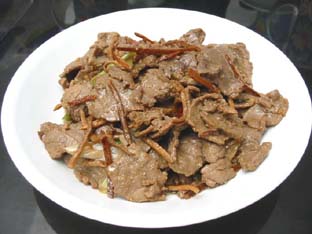 2. 油鍋燒熱油,放入牛肉片炸至變色,撈出。炒鍋加熱油 2大匙,炒香陳皮絲、辣椒、蔥段、薑末,然後倒入調味料B煮滾,改小火,牛肉片回鍋同炒至湯汁收乾入味。灑麻油少許即可起鍋裝盤。